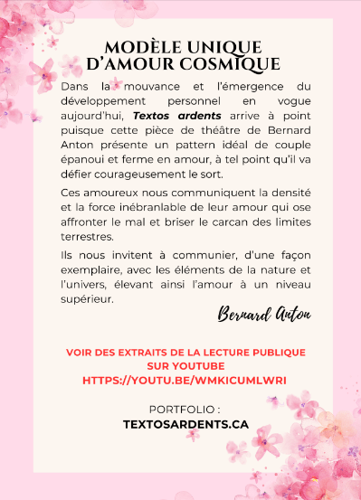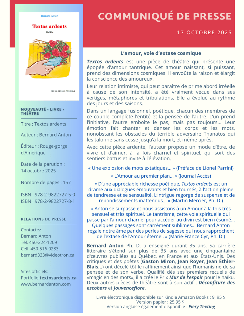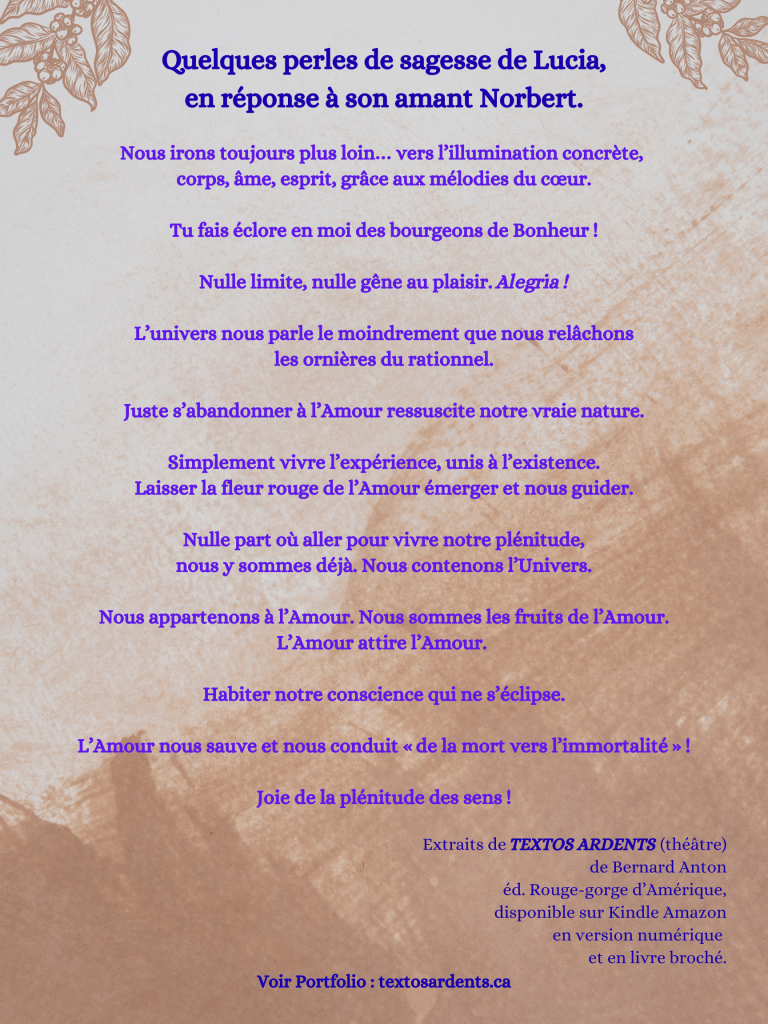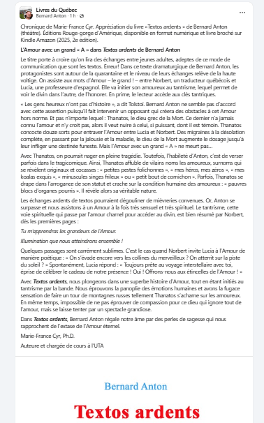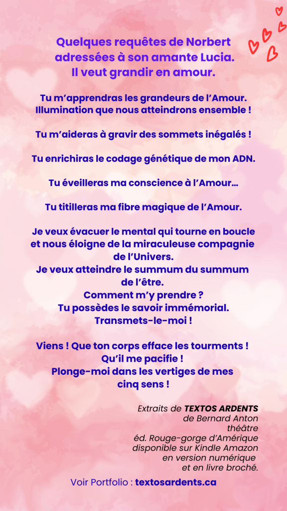 Textos ardents de Bernard Anton est une véritable célébration de l’Amour avec un grand « A ». Ces échanges de textos sont d’une intensité rare. Les amoureux, Lucia et Norbert, nous entraînent dans une relation sensuelle et profondément humaine.